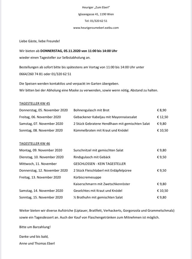 Ab Donnerstag, 5.11. bieten wir täglich außer Mittwoch, einen Tagesteller zur Abholung zwischen 11:00 und 14:00 an.